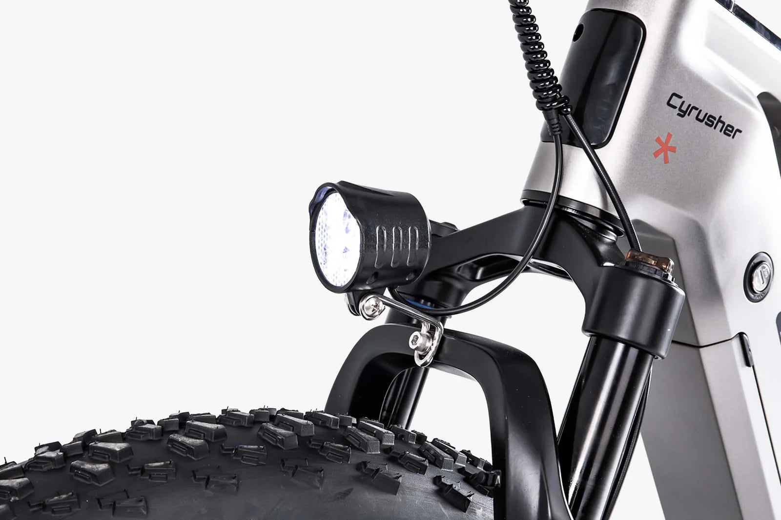 The Cyrusher Zenith is fitted with Chaoyang 26” x 4.0” fat tires, which offer excellent grip and stability on a variety of surfaces, including sand, snow, gravel, and asphalt. These wide tires enhance traction and make the bike suitable for all-terrain riding.